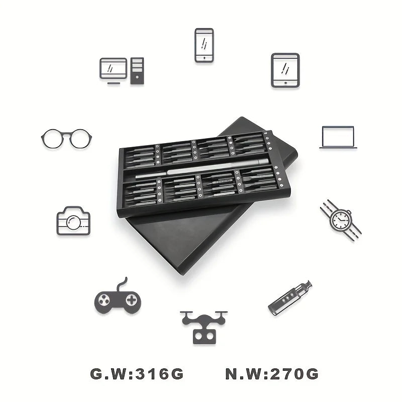62 typov profesionálnych skrutkovacích bitov, od presných PH000 až po praktické P5 (☆1.2), každé otočenie je snahou o presnosť. Či už ide o malé elektronické zariadenia alebo robustný nábytok, táto všestranná súprava skrutkovačov vám môže pomôcť.