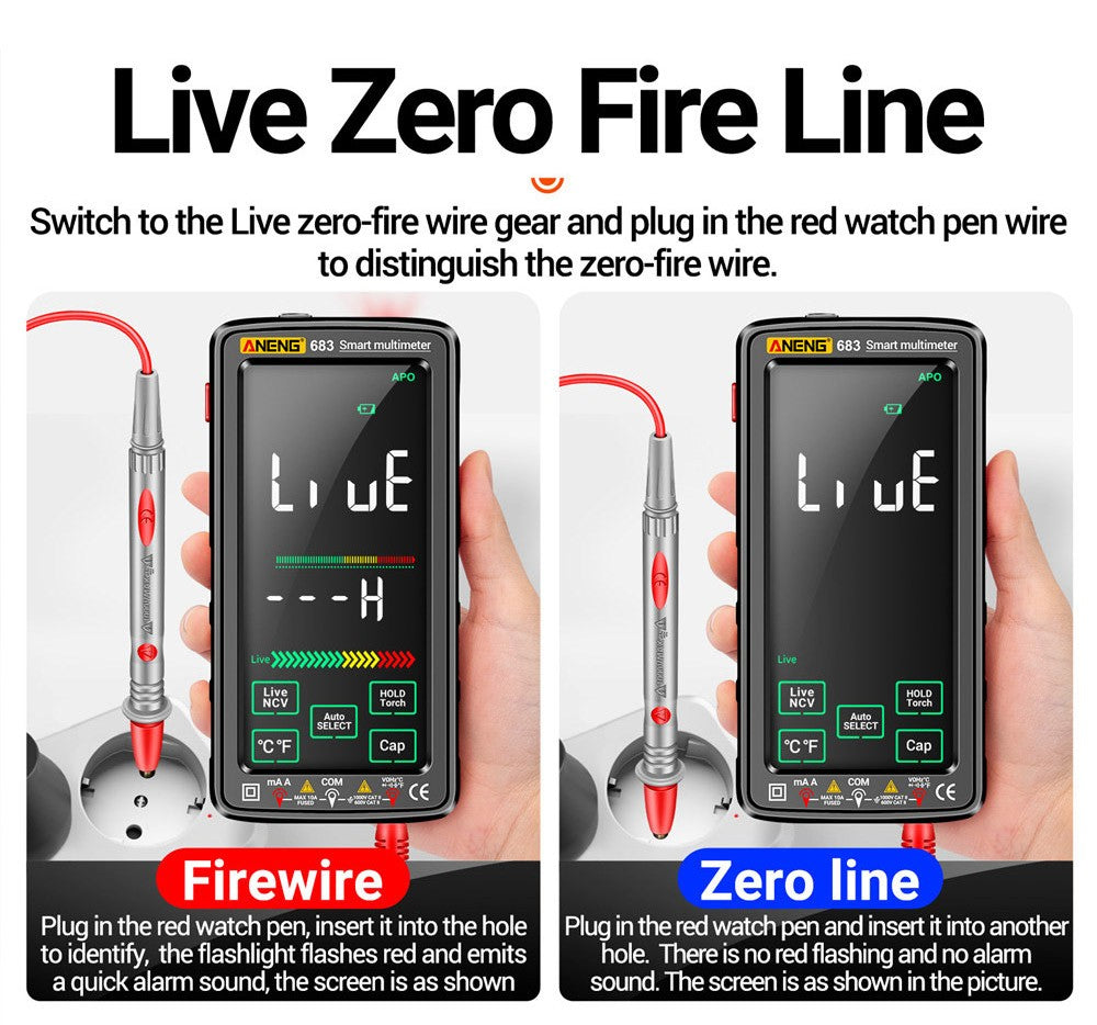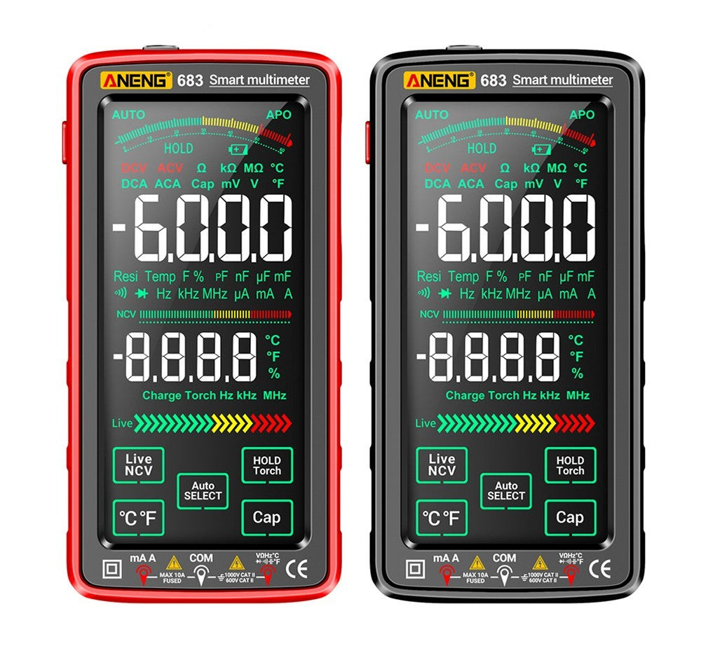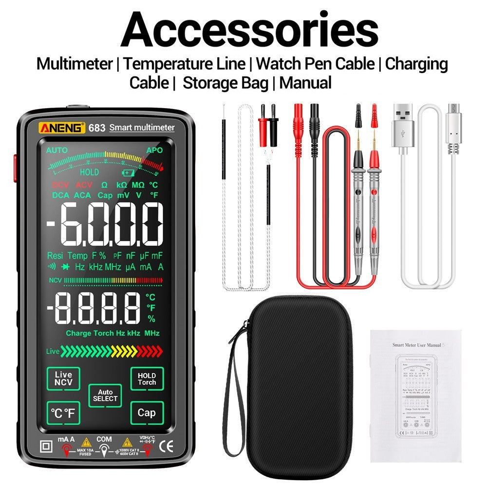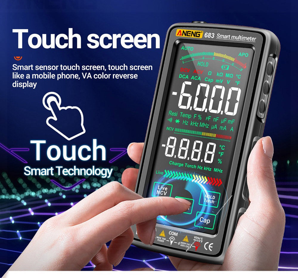 ANENG 683 je digitálny multimeter s stabilným výkonom a spoľahlivou kvalitou. Multimeter využíva LCD displej s inteligentným dotykovým senzorom a farebným inverzným zobrazením VA. Vstupové striedavé/steačné napätie/odpor sa automaticky identifikuje a zmery.