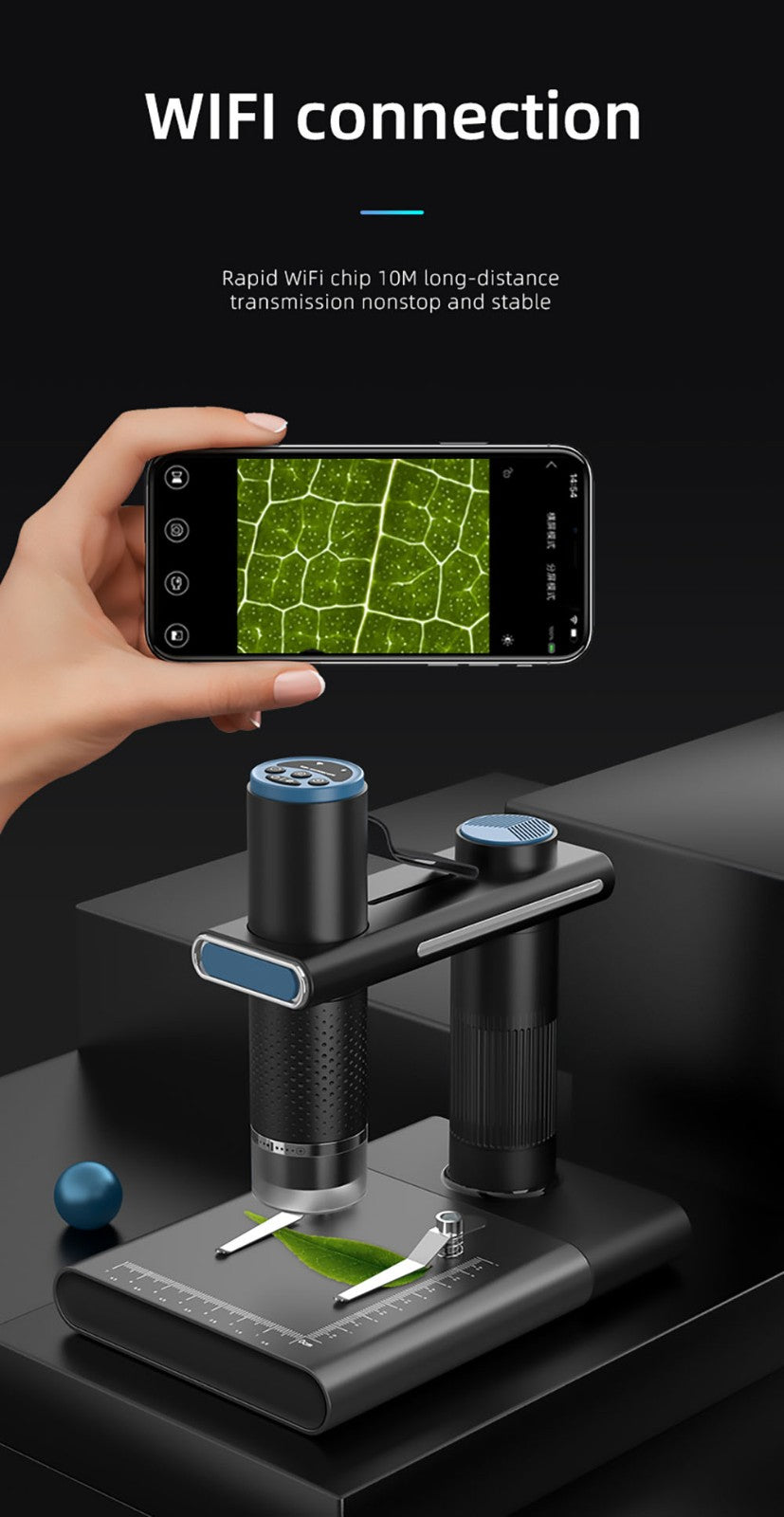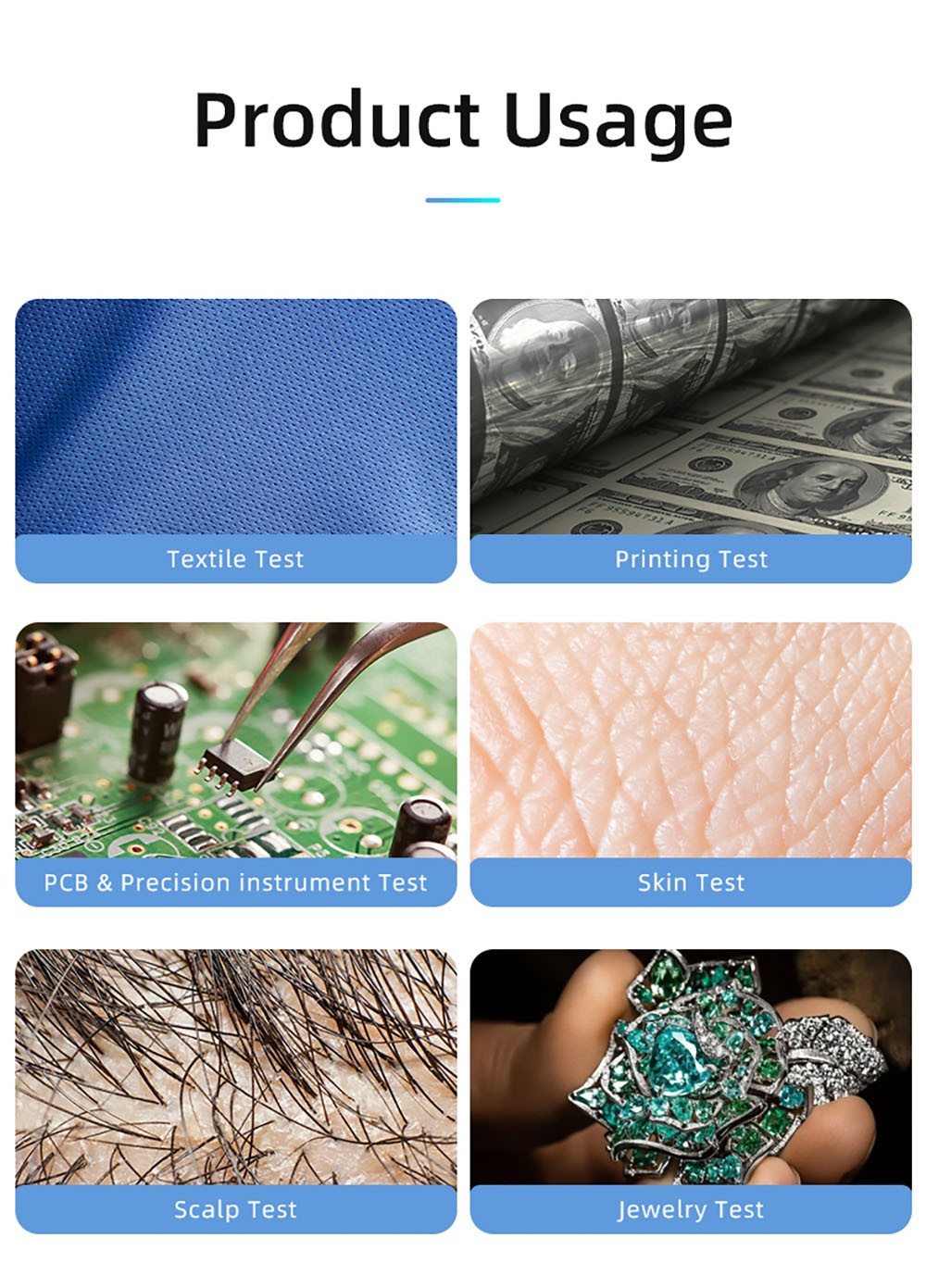 4. Digitálny mikroskop s Wi-Fi sa široko používa v rôznych aplikáciách v rôznych odvetvích, ako je kontrola textilu, kontrola tlače, testovanie presných strojov na výrobu plošných spojov, na vzdelávacie účely, kontrola vlasov, vyšetrovanie kože, mikrobiologické pozorovania a kontrola šperkov a mincí.