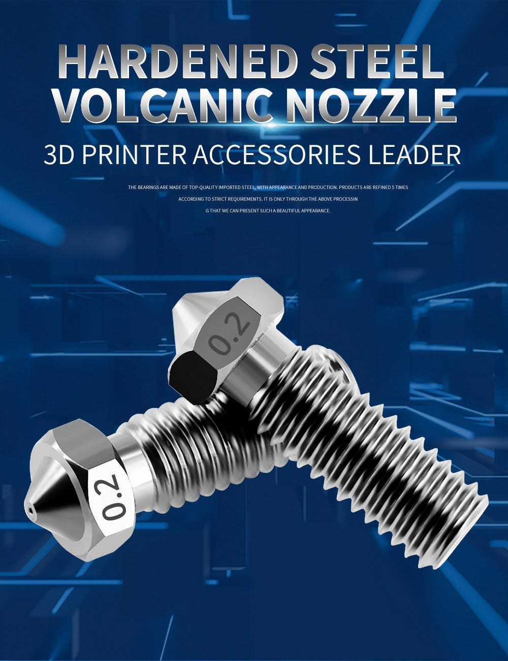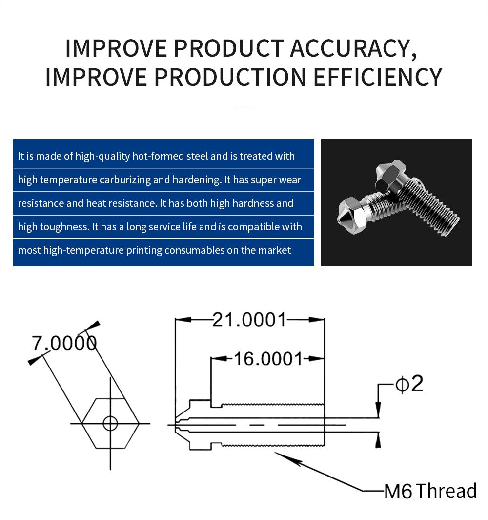1. Vďaka použitie vysoko kvalitného tepelného tvarovania, vysokoteplotného karburizovania a kalenia má táto tryska vynikajúcu odolnosť proti opotrebeniu, tepelnú odolnosť, vysokú tvrdosť, vysokú húževnatosť a dlhú životnosť. Je kompatibilná s väčšinou vysokoteplotných tlačových filamentov na trhu.