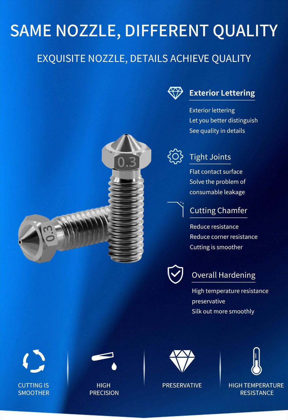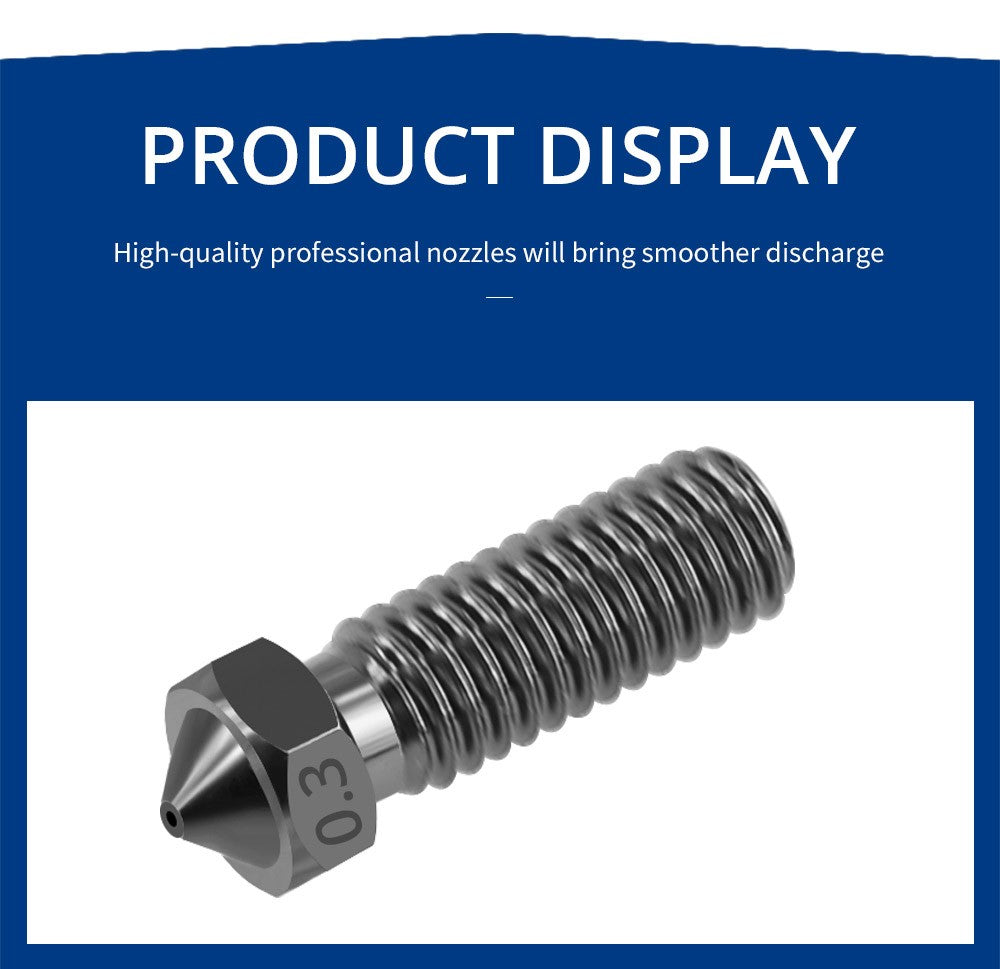1. Vďaka použitie vysoko kvalitného tepelného tvarovania, vysokoteplotného karburizovania a kalenia má táto tryska vynikajúcu odolnosť proti opotrebeniu, tepelnú odolnosť, vysokú tvrdosť, vysokú húževnatosť a dlhú životnosť. Je kompatibilná s väčšinou vysokoteplotných tlačových filamentov na trhu.