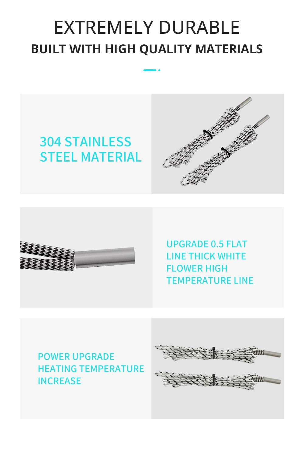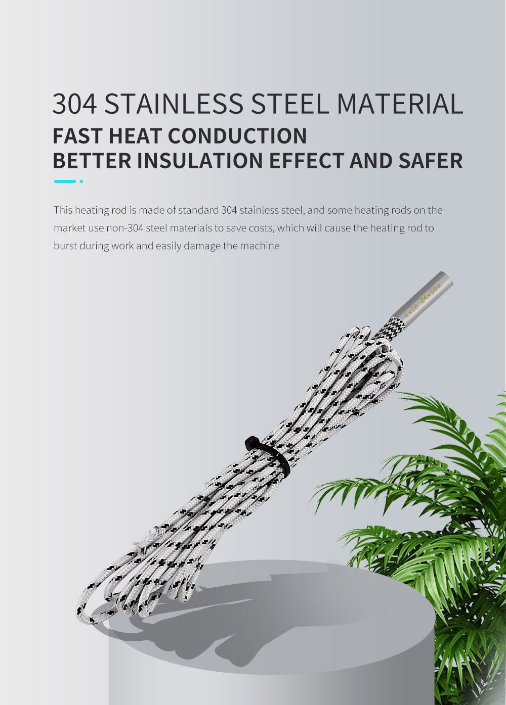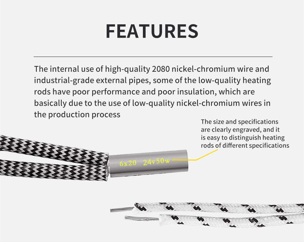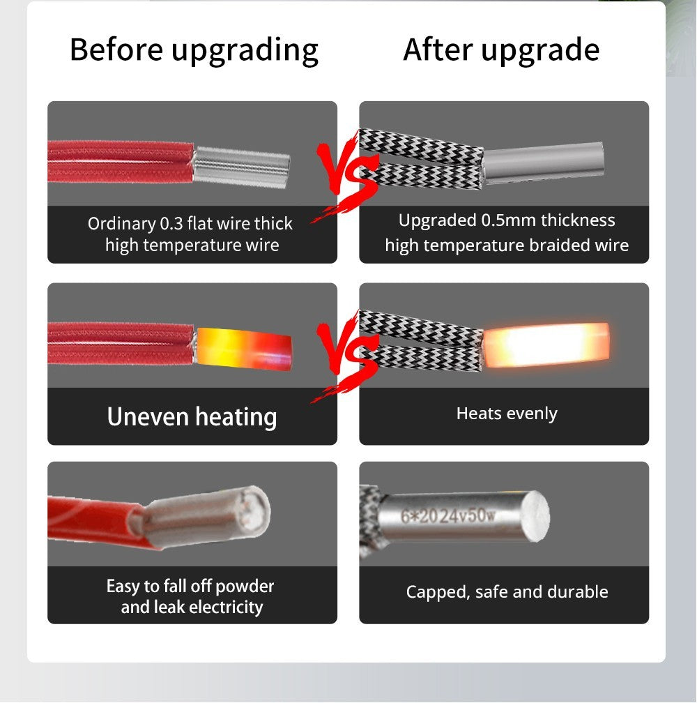 1. Od pôvodného 0,3 mm vysokoteplotného drôtu až po 0,5 mm hrubý vysokoteplotný opletený drôt, tento vykurovaci prút rovnomerne zahrieva a je bezpečný a odolný.