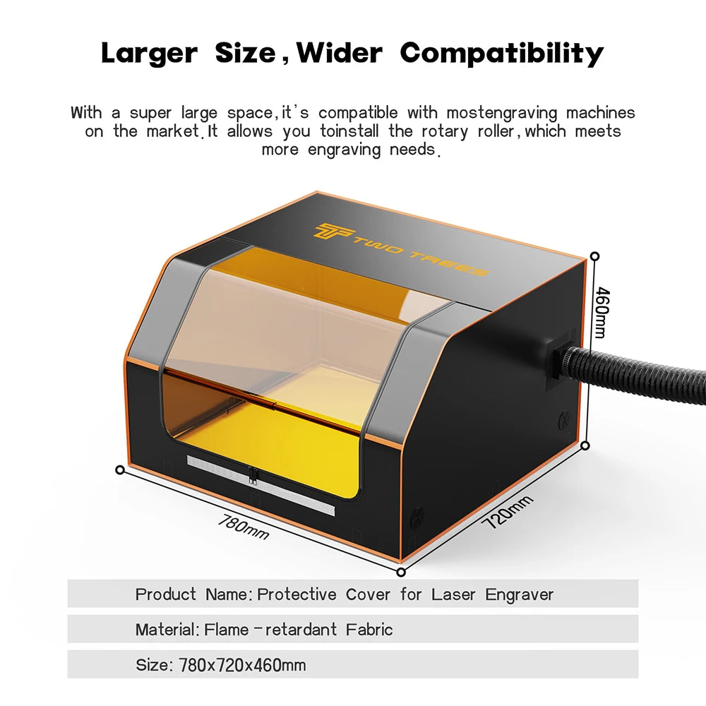 Veľký priestor pre ochranné puzdro laserového gravírovacieho stroja (780x720x460mm). Vyšší ako iný kryt na laserové gravírovanie, môže byť použitý na laserové rotačné gravírovanie vyšších predmetov. Kompatibilné s dvoma stromami a väčšinou ostatných laserových gravírovacích strojov.