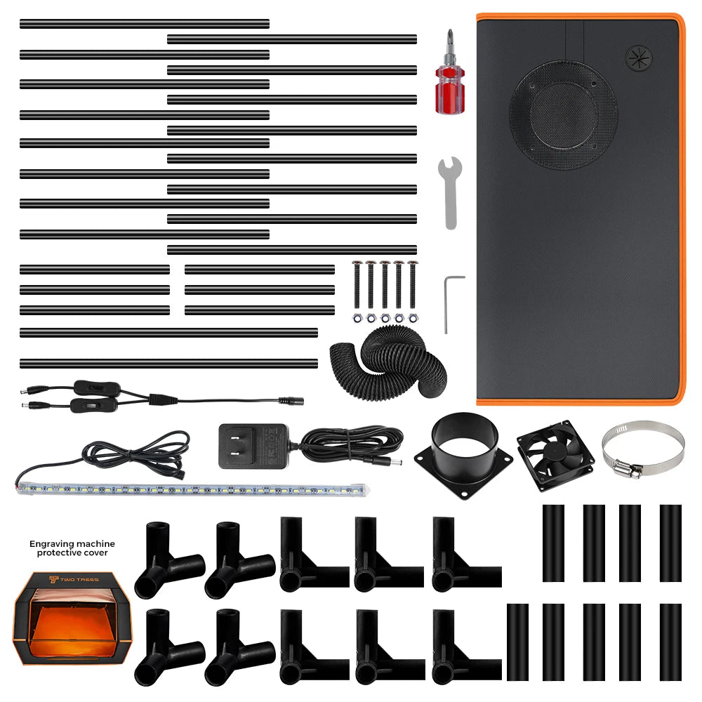 Kryt laserového gravírovača Twotrees je navrhnutý pre pohodlie a jednoduché použitie. Je skladací a skladný, vďaka čomu sa v prípade potreby ľahko prenáša a nastavuje. Držiak z nehrdzavejúcej ocele poskytuje dodatočnú stabilitu a zaisťuje, že váš laserový gravírovací stroj zostane bezpečne na svojom mieste. Kryt je dodávaný s výstupom vzduchu a 3M dlhým ventilačným potrubím, ktoré možno ľahko pripojiť, aby sa odstránil dym a zápach počas prevádzky. Dizajn krytu je nielen funkčný, ale aj esteticky príjemný a bez problémov zapadne do akéhokoľvek pracovného priestoru. Vďaka svojej kompatibilite s inteligentnými zariadeniami a kompatibilite s väčšinou laserových gravírovacích strojov, vrátane Two Trees, je tento kryt nevyhnutnosťou pre každého seriózneho laserového gravírovača.