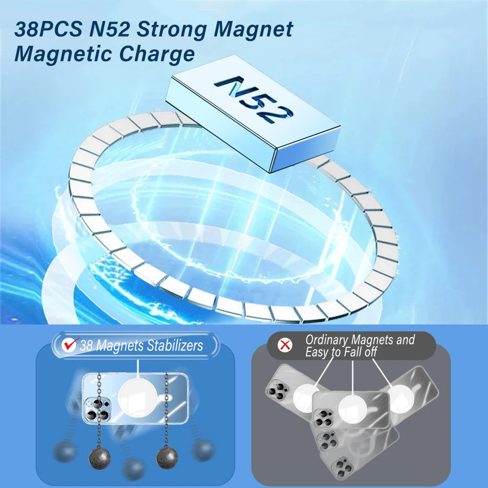 【36+2 silné magnety】 Toto puzdro pre iPhone je vybavené 38 silnými magnetmi N52, ktoré dokážu pri nabíjaní veľmi pevne držať telefóny. Magsafe môžete stále bez problémov nabíjať svoj iPhone aj počas jazdy alebo hraní hier, bez ohľadu na vibrácie alebo nerovnosti na ceste.