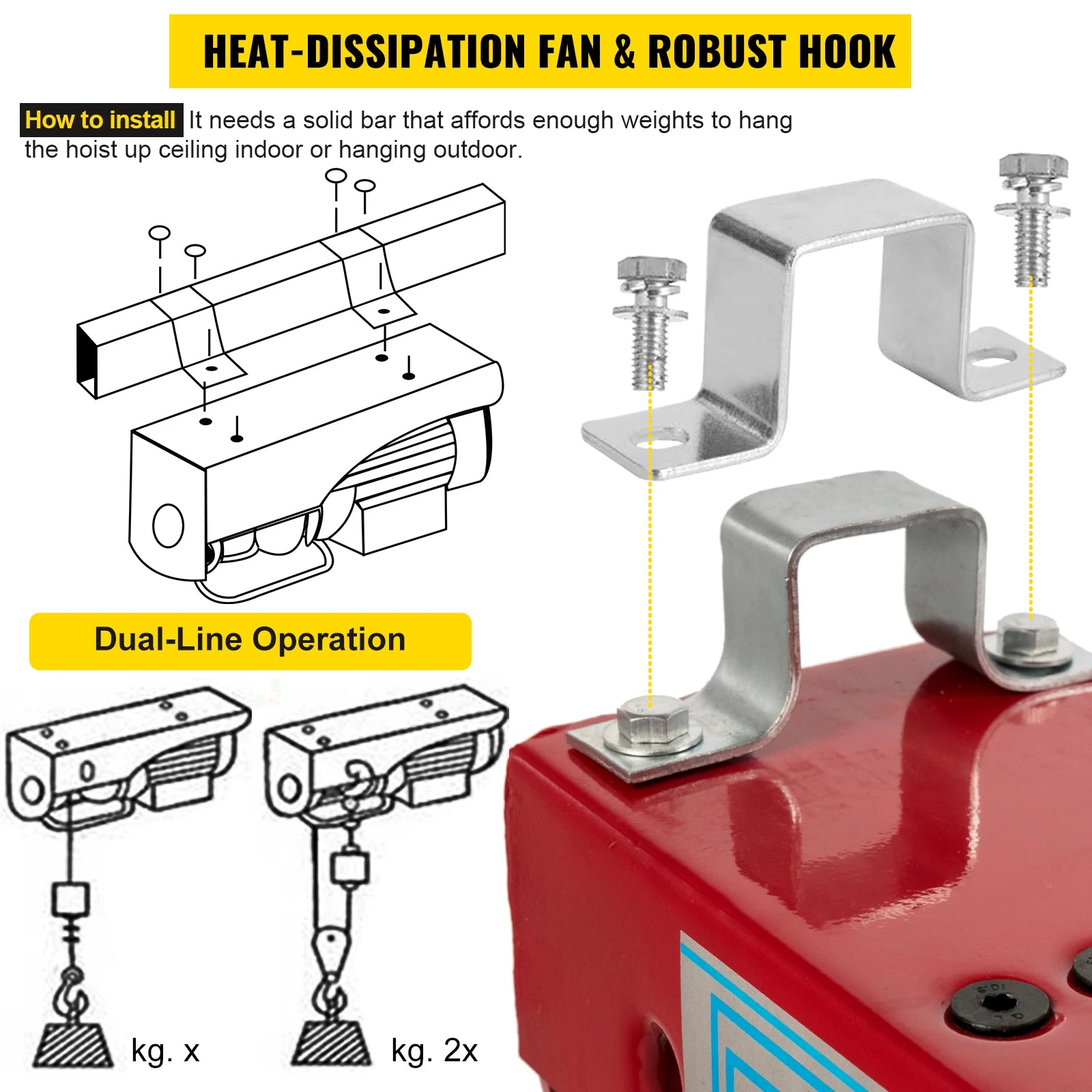 Tento zdvíhací elektrický kladkostroj je určený na zdvíhanie a presúvanie náročných aplikácií. Oceľová konštrukcia a motor z čistej medi ho robia odolným a vysoko účinným. Kladkostroj je možné použiť s jednou šnúrou s nosnosťou 440 lbs/200 kg alebo s dvojitými šnúrami s nosnosťou 880 lbs/400 kg. Je to ideálny manipulačný nástroj pre továrne, doky, sklady, zdvíhanie tovaru, staveniská a iné miesta.