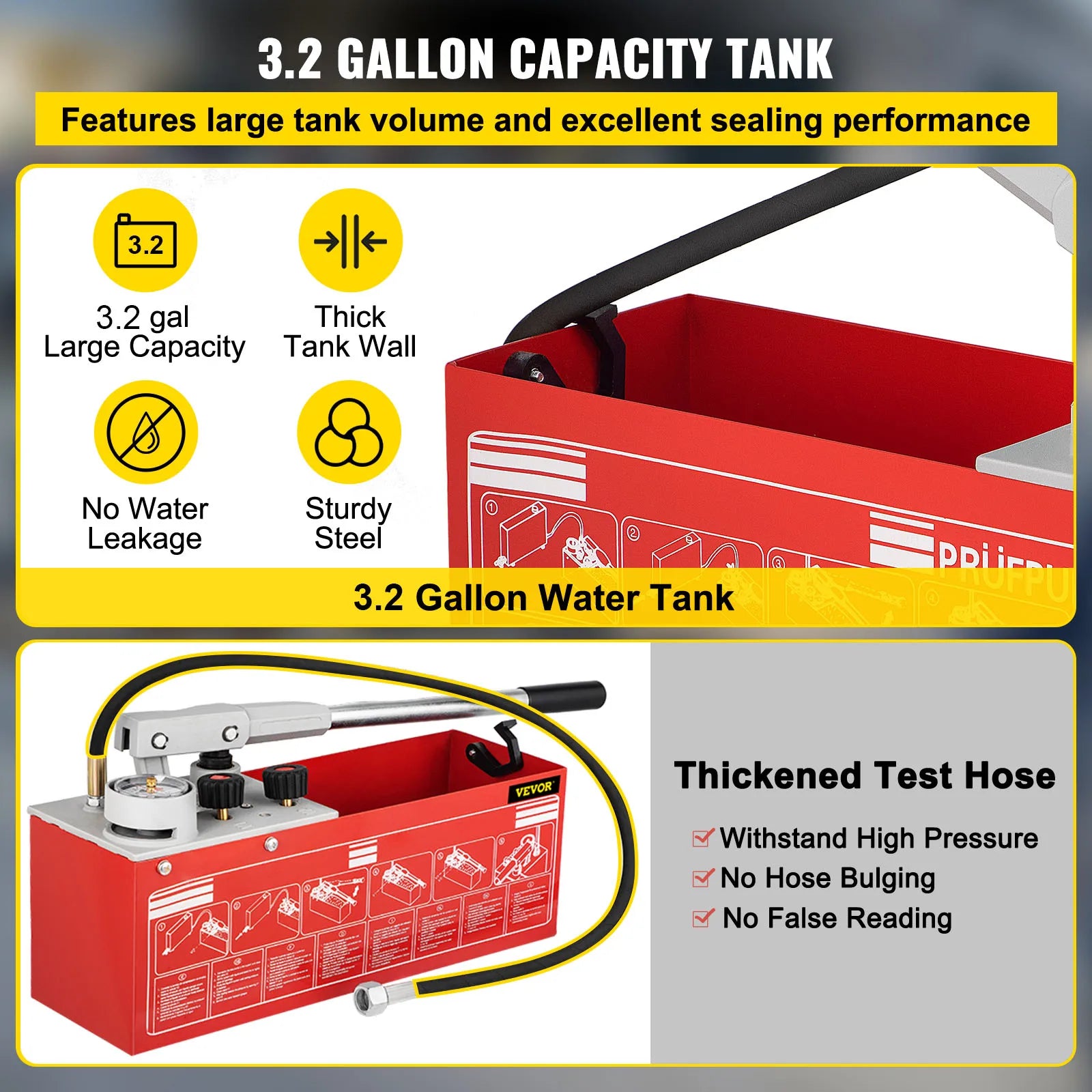 3,2 galónová vodná nádrž: Táto prenosná ručná pumpa sa dodáva s 3,2 galónovou nádržou na vodu, ktorá je navrhnutá so zosilnenou stenou a vynikajúcim tesniacim výkonom, vďaka čomu nie je ľahké uniknúť po dlhšiu dobu. Testovacia hadica odolá vysokému tlaku a zabezpečí presné odčítanie.