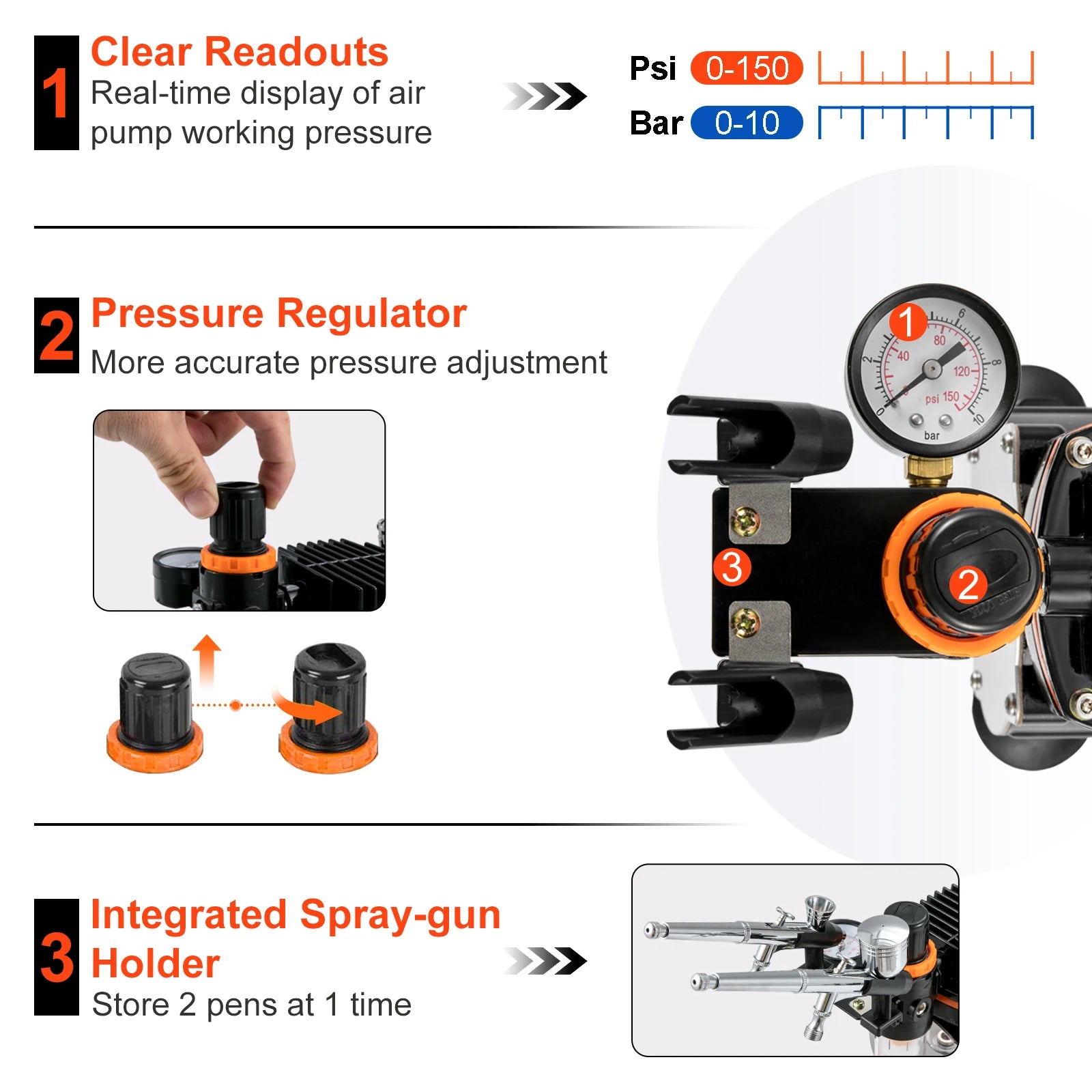 Profesionálny kompresor: Pripravte sa na vytvorenie novej cesty kreativity. Vysokoúčinný vzduchový kompresor možno rýchlo nafúknuť a pracovať stabilne po dlhú dobu. Vybavený nastaviteľným tlakovým ventilom, môžete pohodlne kontrolovať tlak v reálnom čase. Navrhli sme tiež pohodlnú rukoväť na vrchu stroja, ktorú môžete prenášať a presúvať.