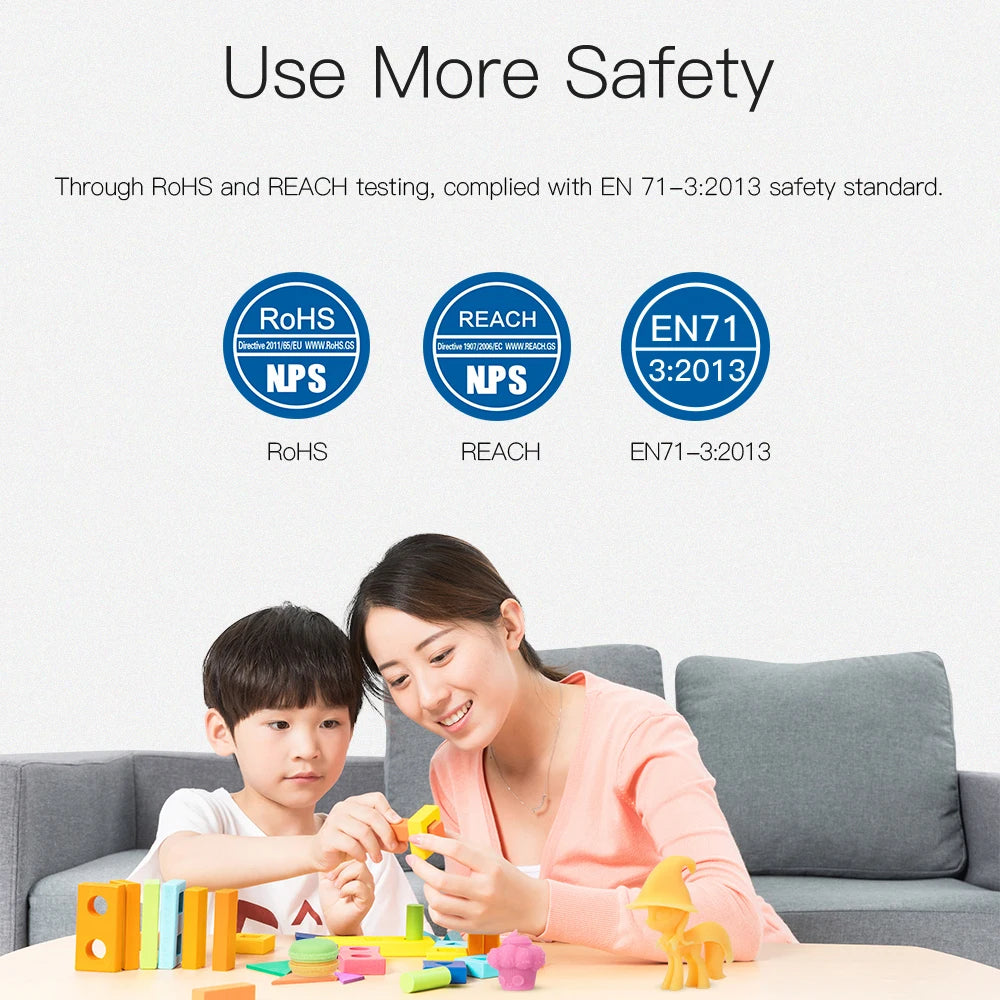 • Bez VOC, bez BPA, bez škodlivých chemikálií. Vyhovuje bezpečnostnej norme EN 71-3:2013.