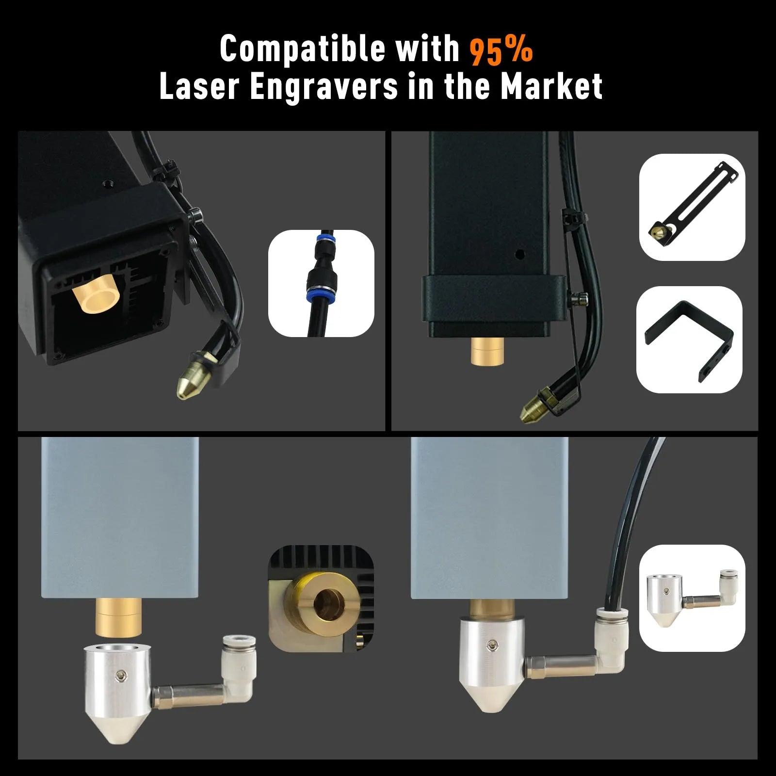 Vzduchová pomocná pumpa so širokou kompatibilitou – Táto laserová vzduchová pomocná pumpa je navrhnutá pre 99 % laserových rytcov na trhu. K dispozícii je vzduchová pomocná dýza s trubicou (ktorá potrebuje veľkosť laserového modulu 40 x 40 mm), dýza s priamym fúkaním, U-svorka, konverzná trubica, dva imbusové kľúče, podložky M3, skrutky M3 * 4 , dve skrutky M3*10, čo umožňuje dobre pracovať pre 99% laserovú rezačku.