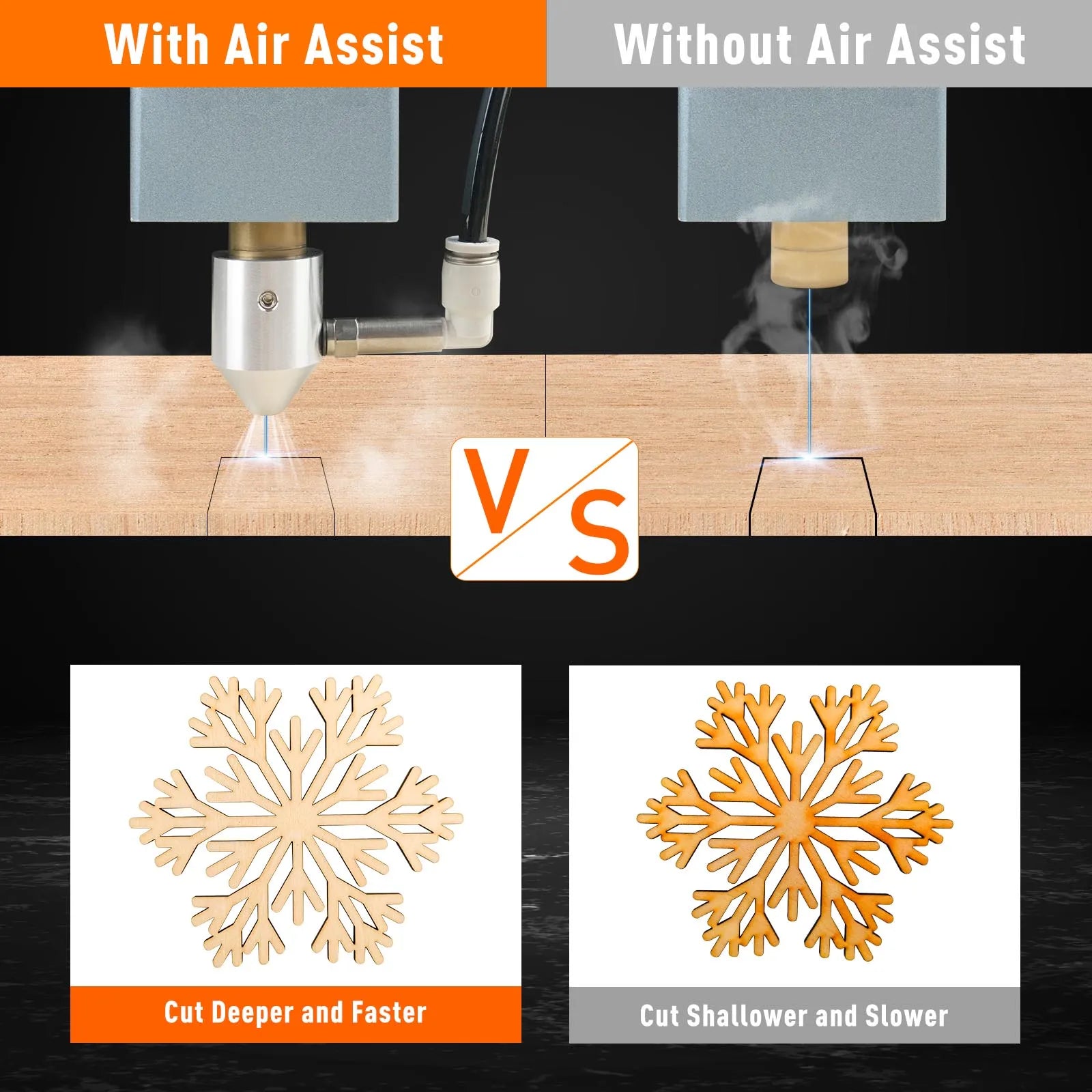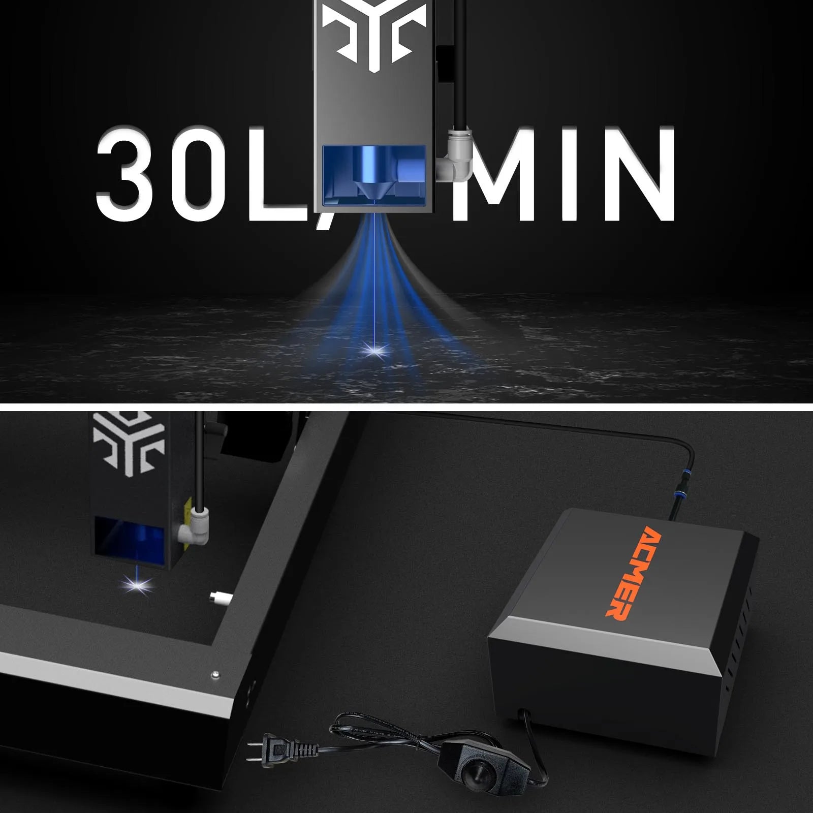 Ochrana pre vašu laserovú hlavu - Príslušenstvo ACMER C4 Air Assist môže odfúknuť prijateľné nečistoty a dym generovaný počas práce laserovej hlavy, aby chránil šošovku hlavy prenájmu pred kontamináciou, čo môže výrazne zlepšiť životnosť laserovej hlavy a účinnosť rezania laserového gravírovača. .