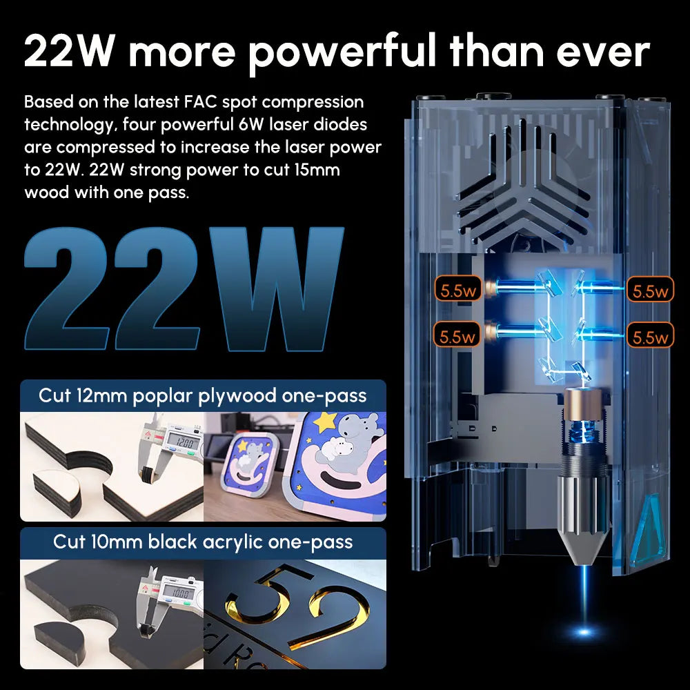 1. 【Super vysoký 22W optický výkon】: Najpokročilejšia technológia COS umožňujúca naraz rezať 30 mm borovicovú dosku/10 mm čiernu akrylovú dosku/5 mm MDF a dokonca aj 0,1 mm plech z nehrdzavejúcej ocele. môže ľahko rezať 50 mm hrubé drevo a 50 mm hrubý čierny akryl s viacerými operáciami; môže priamo gravírovať zrkadlovú nehrdzavejúcu oceľ, keramiku, nepriehľadné sklo a iné materiály.
