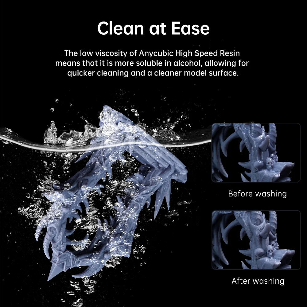 Nízka viskozita Anycubic High Speed Resin znamená, že je lepšie rozpustná v alkohole, čo umožňuje rýchlejšie čistenie a čistejší povrch modelu.