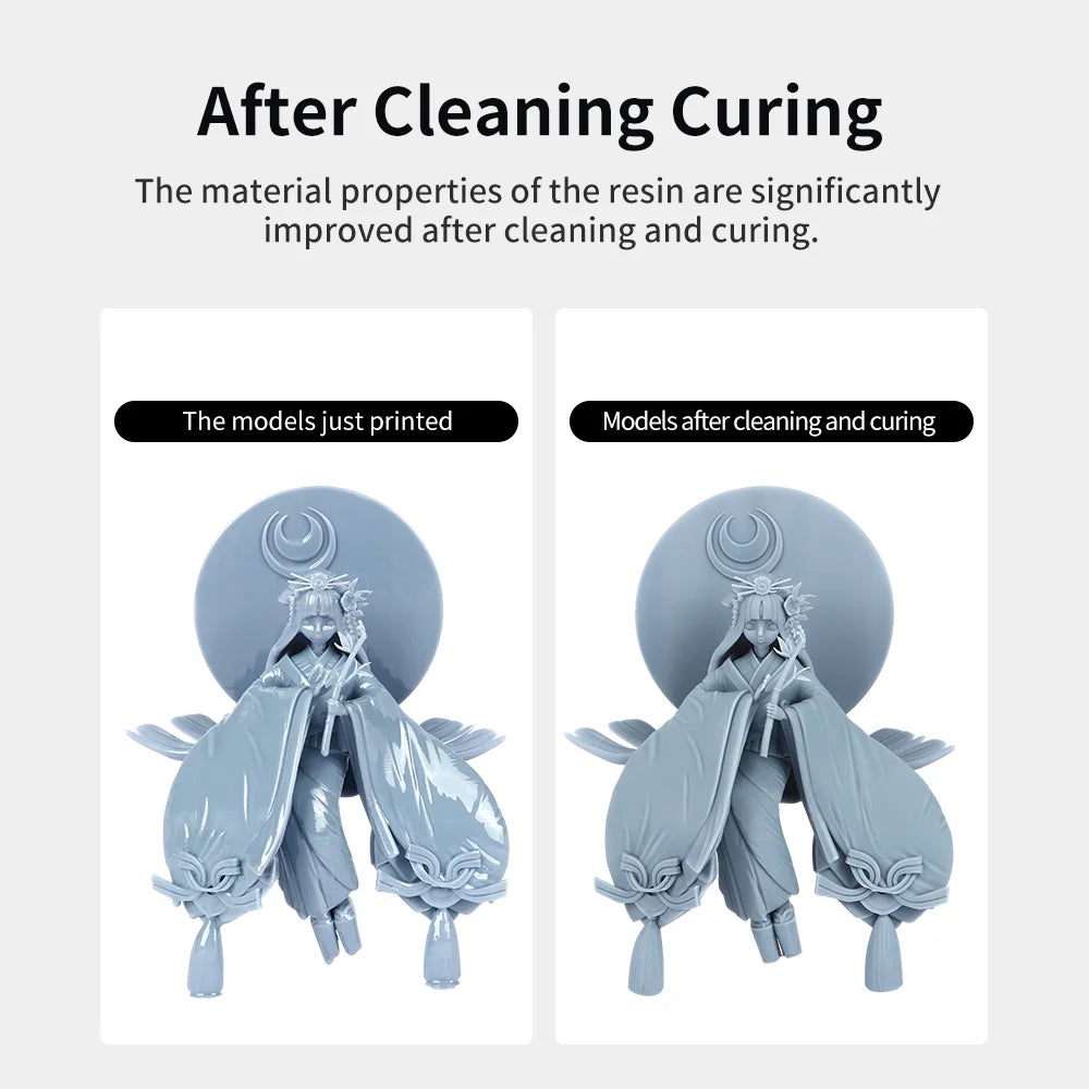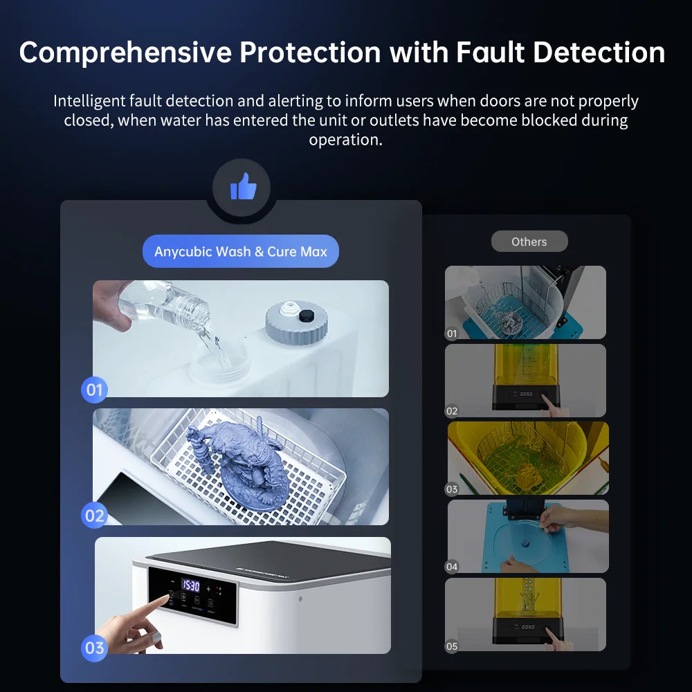 Prijatie dvoch úplne nových režimov oplachovania sprejom a namáčania detailov zaisťuje efektívne a dôkladné čistenie. Výkonné mechanické vstrekovanie eliminuje zvyškovú živicu na povrchu tlače, zatiaľ čo spodné máčanie účinne odstraňuje živicu zo zložitých detailov.