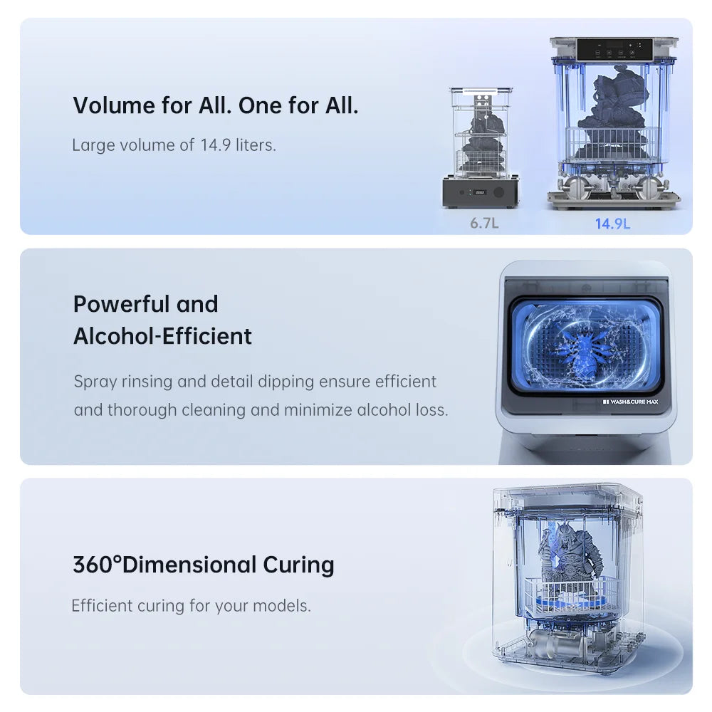 Jednotka pojme až 14,9 litra (15,7 qts.), čím prevyšuje veľkosť väčšiny umývacích a vytvrdzovacích strojov na trhu. Pôsobivá maximálna veľkosť čistenia 300*165*300 mm (11,8”x 6,5” x 11,8”) je kompatibilná s takmer každou živicovou 3D tlačiarňou spotrebiteľskej triedy s rozmermi 13,6” (35 cm) a menej dostupnou na trhu.