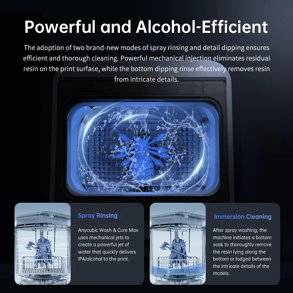 Prijatie dvoch úplne nových režimov oplachovania sprejom a namáčania detailov zaisťuje efektívne a dôkladné čistenie. Výkonné mechanické vstrekovanie eliminuje zvyškovú živicu na povrchu tlače, zatiaľ čo spodné máčanie účinne odstraňuje živicu zo zložitých detailov.