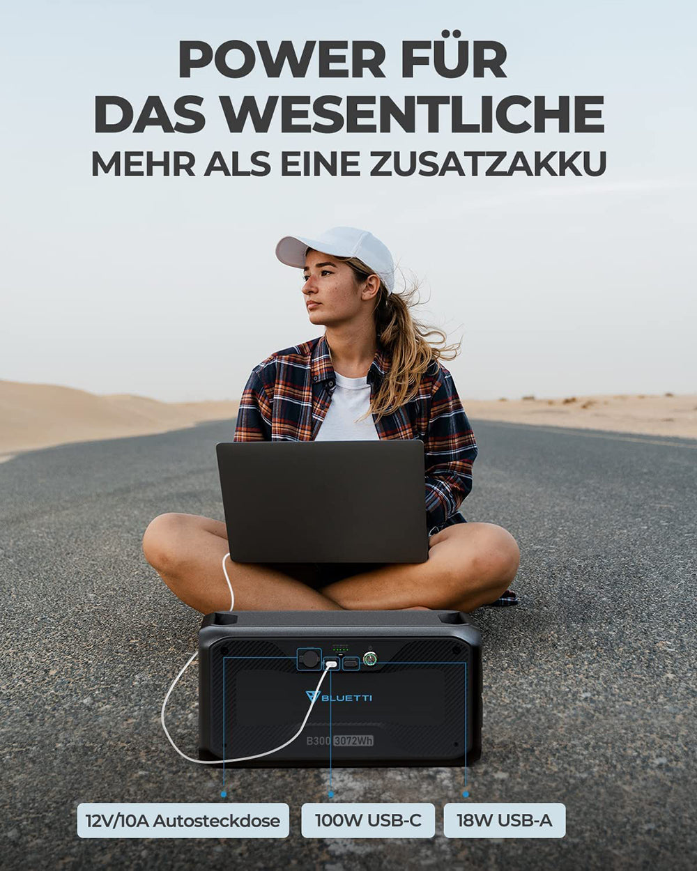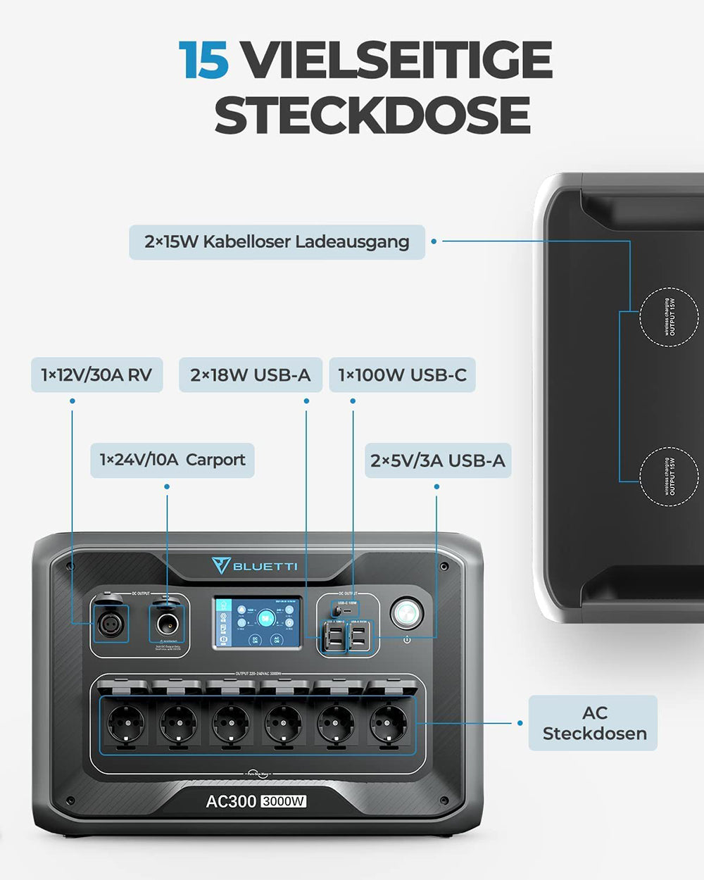 Je vybavený 3000W čistým sinusovým striedačom a dokáže regulovať rýchlosť striedavého prúdu (nie je potrebný zdroj napájania, postačí jeden nabíjací kábel). Systém AC300 sa dá nabíjať striedavým prúdom s výkonom 1800 W až 3000 W cez zásuvky v závislosti od vašich potrieb. Ideálne na napájanie chladničky, mikrovlnnej rúry, klimatizácie, benzínovej sekačky, píly atď.