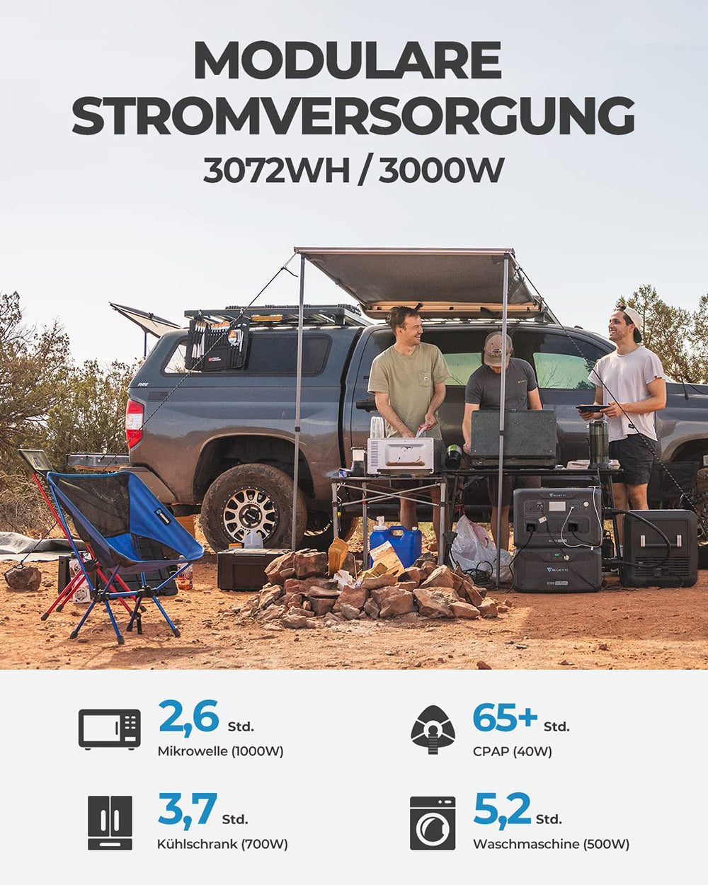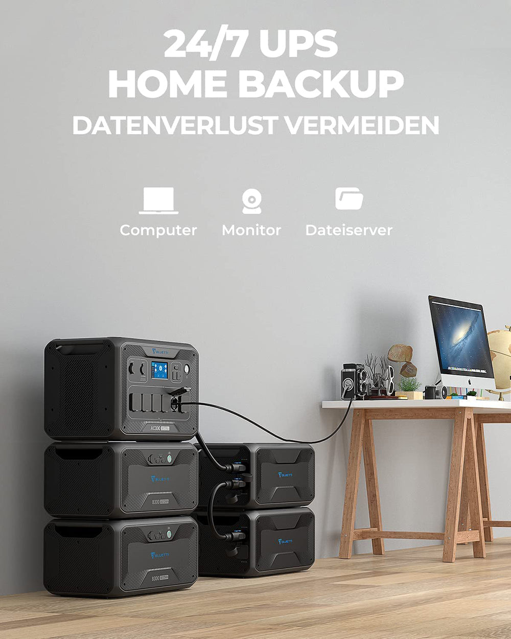 BLUETTI AC300 je 100% modulárny a dokáže pripojiť až 4x B300 (3 072 Wh na modul) batériové moduly na jednotku, čímž dosiahne celkového objemu 12 288 Wh – zabezpečí základné potreby celej rodiny na dni v núdzových situáciách alebo výpadkoch prúdu. (Musí fungovať s B300)