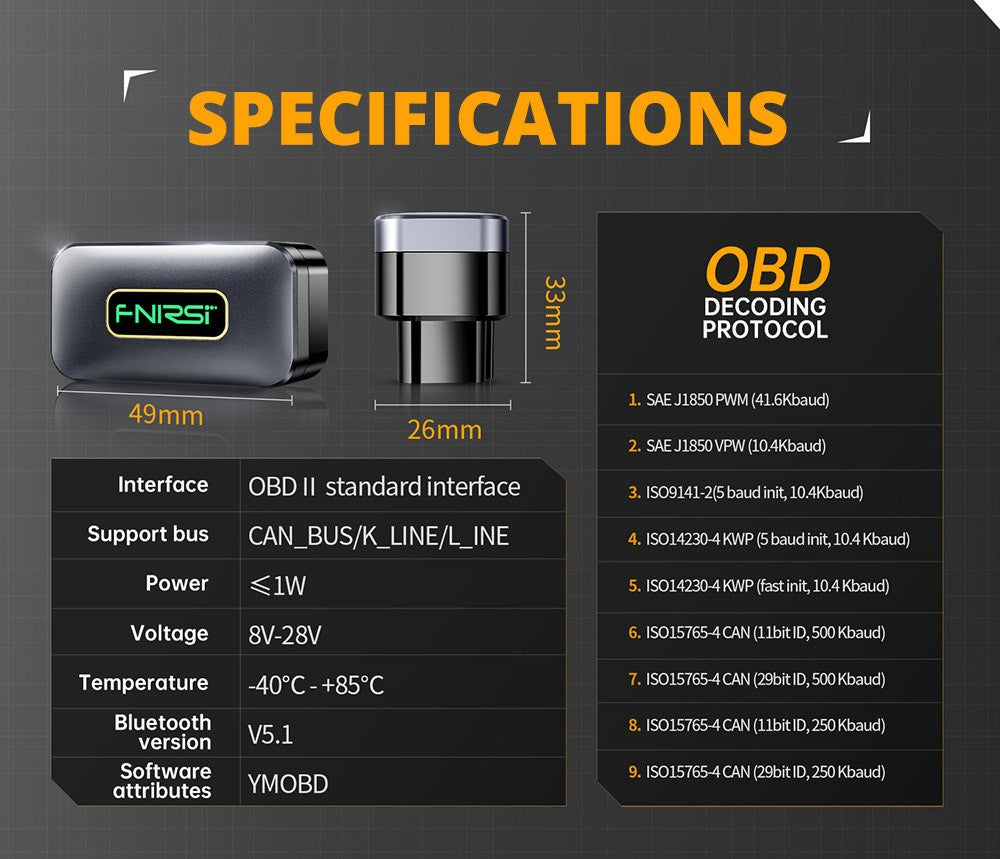 FNIRSI FD10 OBD2 je potrebné používať s aplikáciou tretej strany, Bluetooth V5.1, kompatibilnou s operačnými systémami iOS a Android a podporuje mnoho jazykov. Aplikáciu (YMOBD) si môžete stiahnuť priamo z obchodu Apple App Store alebo Google Play a následne cez svoj mobilný telefón získať prístup k celému novému svetu informácií o vašom vozidle.