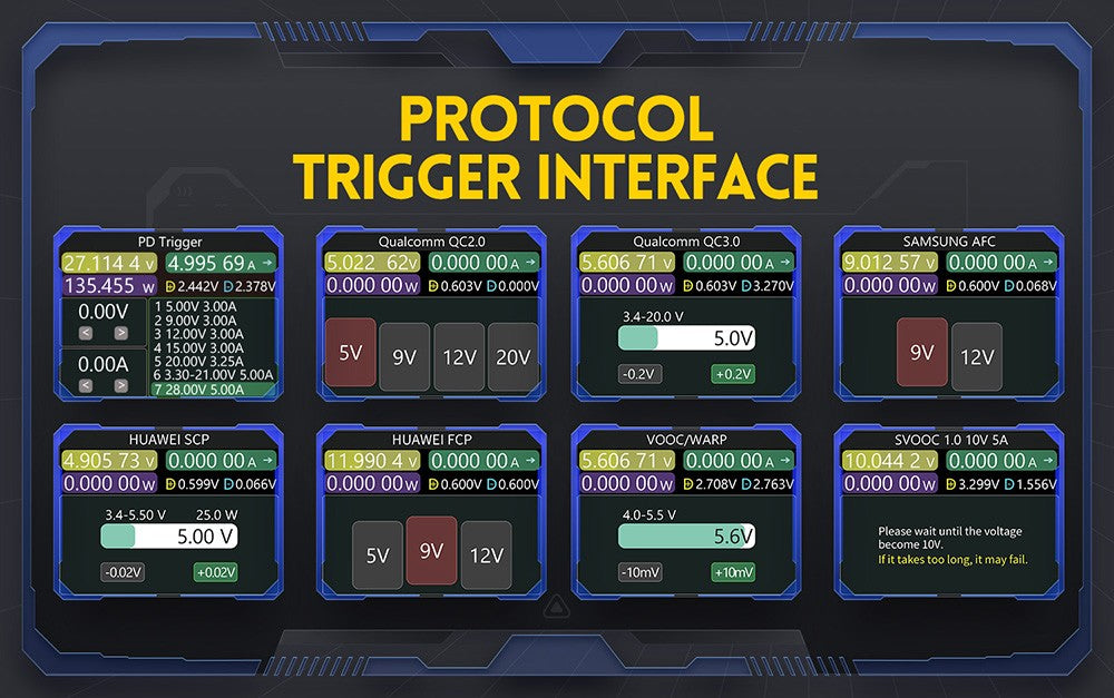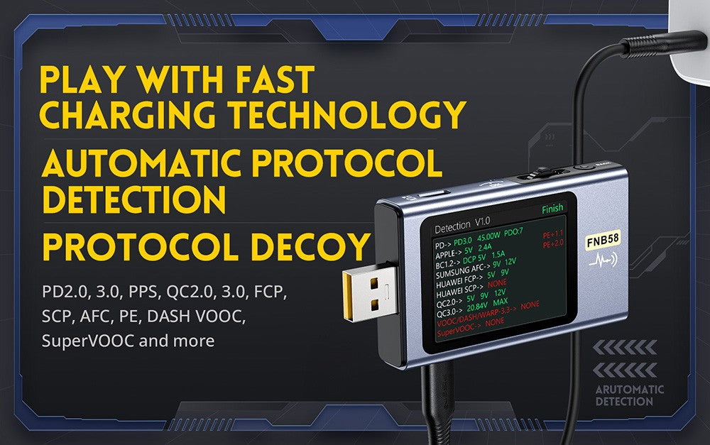 FNB58 podporuje detekciu spúšťacích signálov rôznych protokolov rýchleho nabíjania: spúšť QC2.0/QC3.0, spúšť FCP/SCP, spúšť AFC, spúšť PD2.0/3.0, spúšť VOOC/WARP a spúšť Super VOOC 1.0/2.0. Všetky vyššie uvedené protokoly podporujú automatické monitorovanie. Automatická detekcia MTK-PE. Podpora konverzie protokolu QC2.0 na PD2.0.