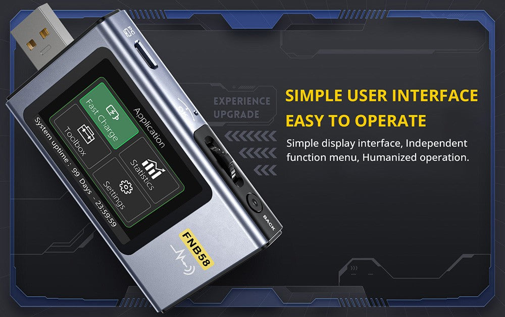 Tester USB FNB58 je vysoko spoľahlivý a bezpečný merač napätia a prúdu USB a spúšť pre rýchle nabíjanie mobilných komunikačných terminálov. Má 2,0-palcový plnefarebný TFT LCD displej s ultra širokým zorným uhlom, integrované rozhrania USB-A, Micro-USB a Type-C. Používa externý 16-bitový ADC a fyzický čip PD protokolu. Dá sa použiť na meranie napájania alebo spotreby energie produktov, ako sú USB rozhrania, nabíjačky mobilných telefónov a U disky; meranie nabíjacieho výkonu mobilných telefónov a vstupného a výstupného napájania mobilných zdrojov; testovanie protokolu rýchleho nabíjania nabíjačiek.