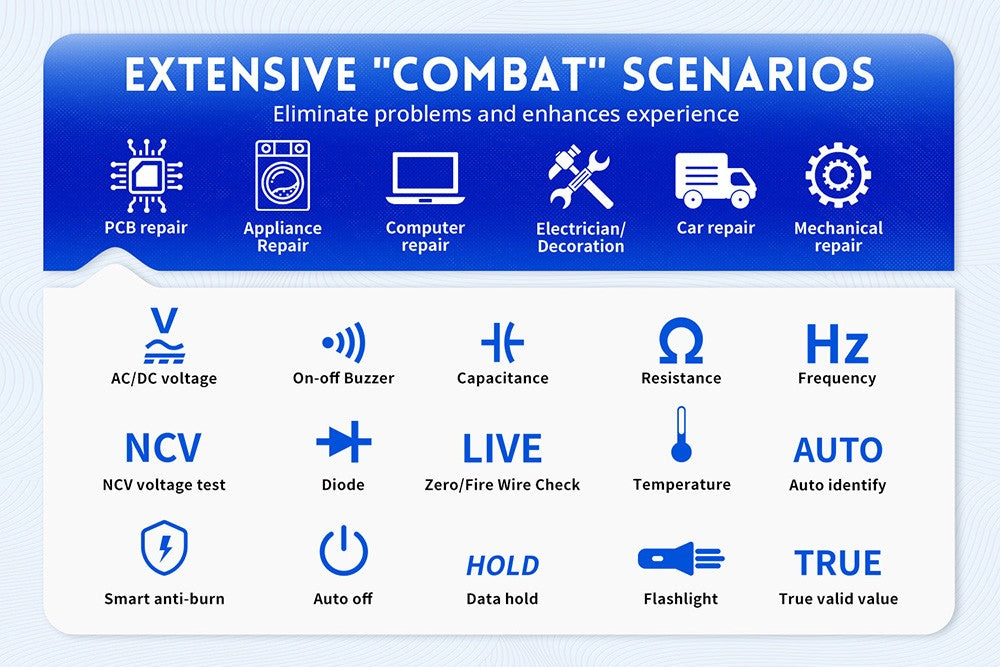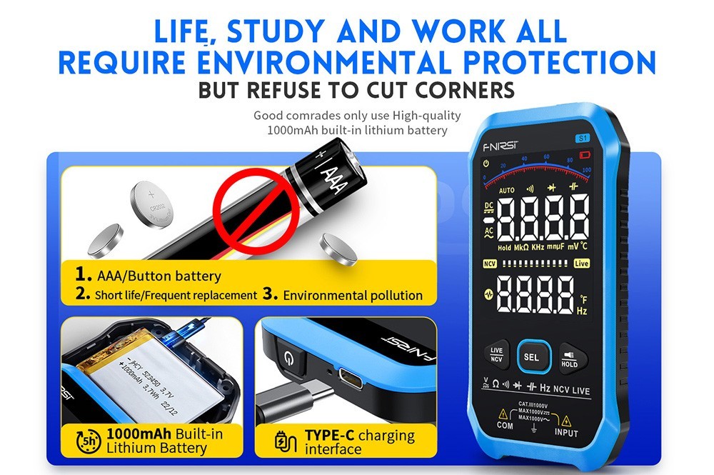 Ručný digitálny multimeter FNIRSI S1 umožňuje presne merať striedavé/stejnosmerné napätie, odpor, NCV, diódy, priepustnosť, kapacitu, teplotu, frekvenciu a prítomnosť napätia. Je to skutočne užitočný nástroj na riešenie elektrických problémov v domácnostiach i v priemysle. Vhodný pre domácíké zásuvky, poistky, batérie (vrátane vozidiel), odstraňovanie porúch automobilových obvodov, nabíjacích systémov, testovanie elektroniky v automobiloch atď.