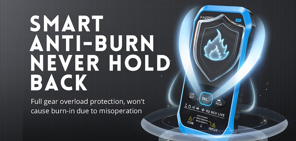 Multimeter FNIRSI S1 je chránený proti prehoreniu a preťaženiu. Štandard pre prepäťové napätie je CAT III 1000 V. Pri nízkej úrovni nabitia batérie sa zobrazí indikácia slabého nabitia.