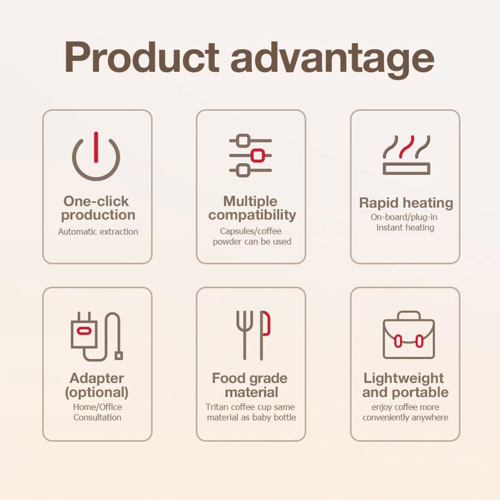 Dodáva sa s úložnou taškou, adaptérom striedavého proudu a skladacím držadlom, takže si môžete kávu vychutnať pohodlnejšie kdekoli, napríklad na vonkajšom kempingu, cestovaní, doma, v práci a podobne.