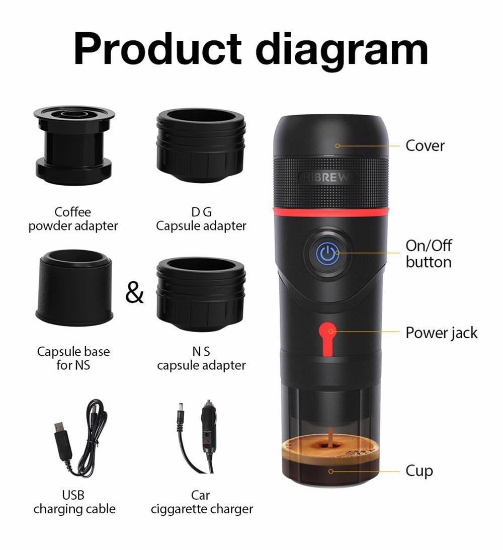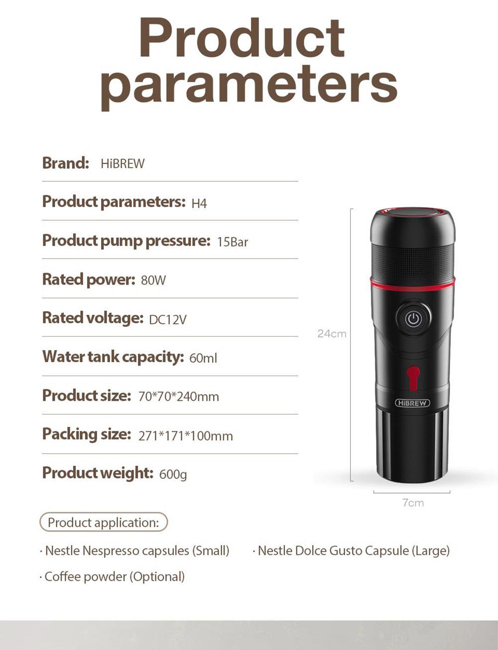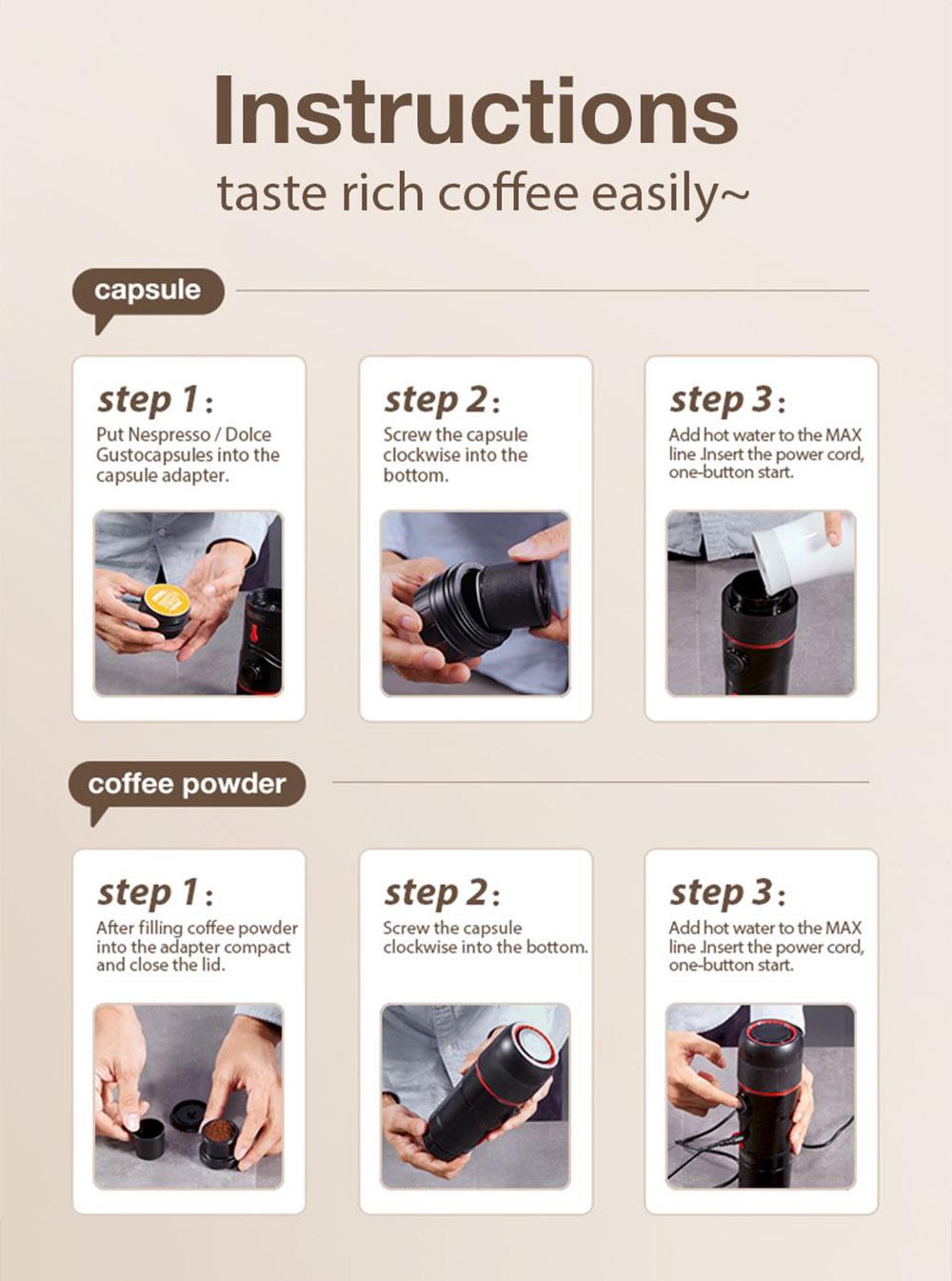 Tento kompaktný, ale výkonný prenosný kávovar do auta je vhodný pre kapsuly Nestle Nespresso (malé), kapsuly Nestle Dolce Gusto (veľké) a kávový prášok (volitelné).